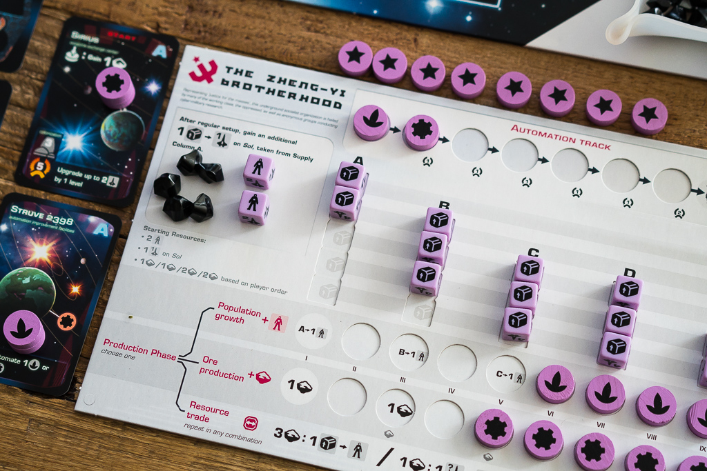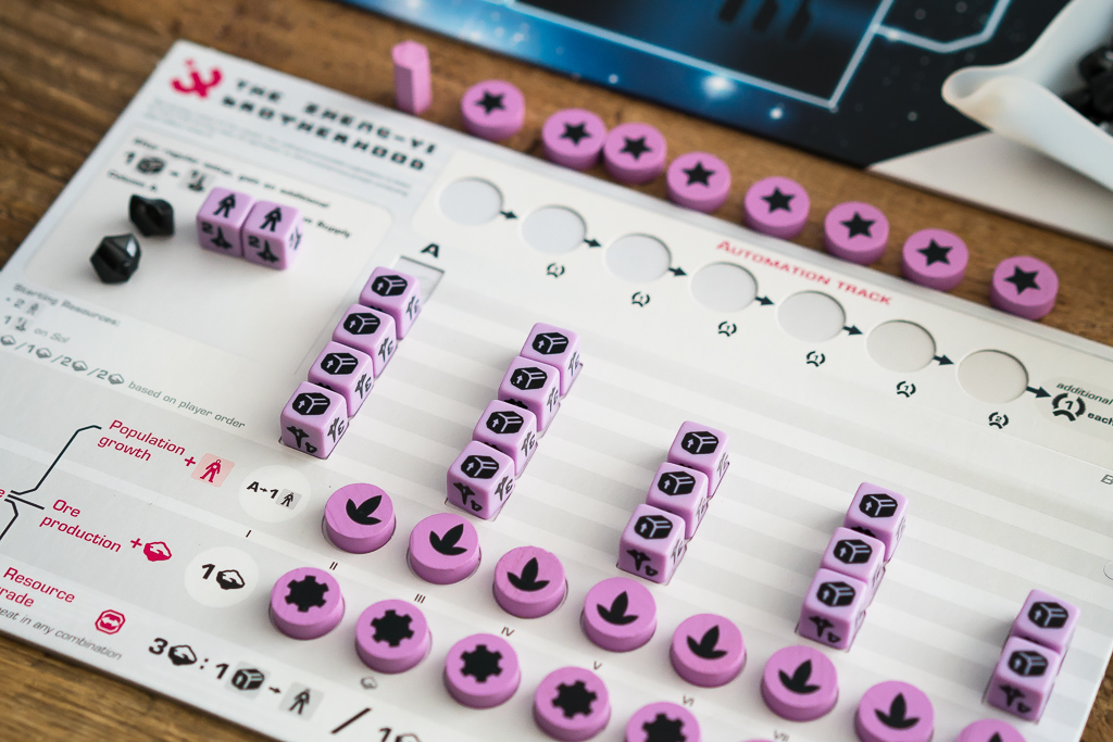Tanto la población como los minerales, los podremos conseguir en nuestra fase de producción y nuestra capacidad de producción aumentará a medida que vayamos liberando esos discos, al estilo de juegos como Terra Mistica.