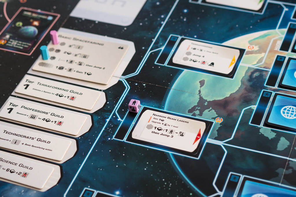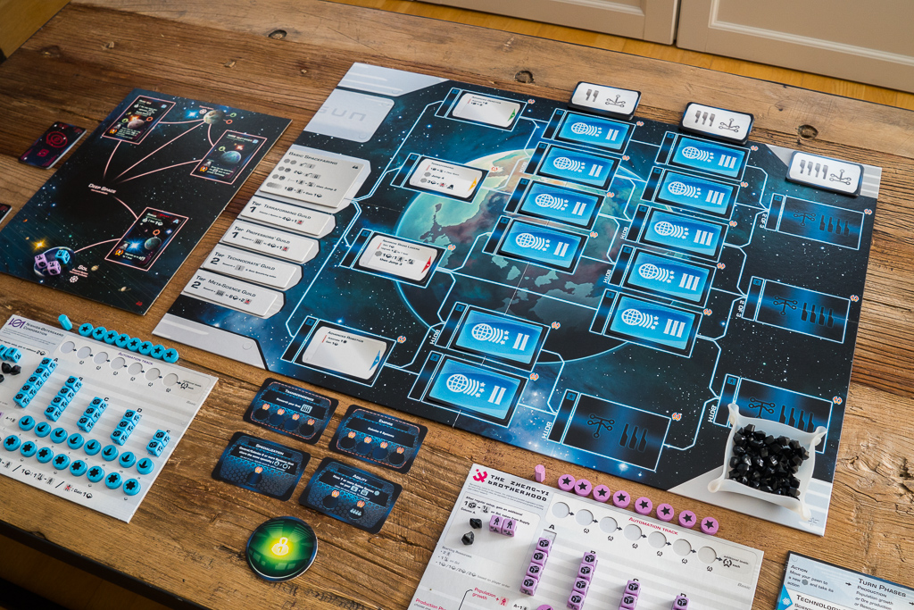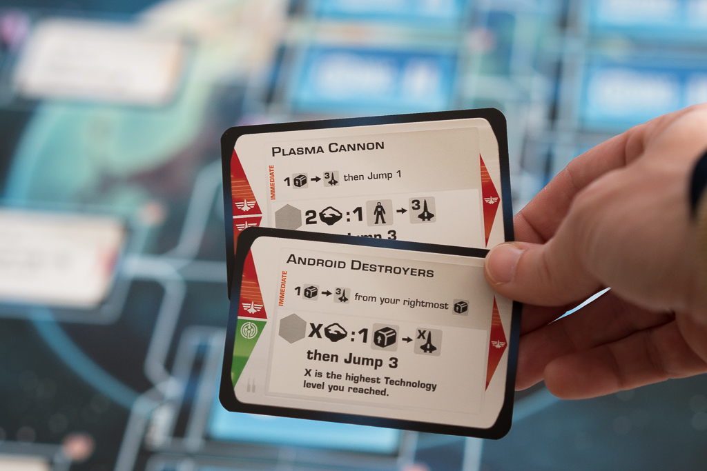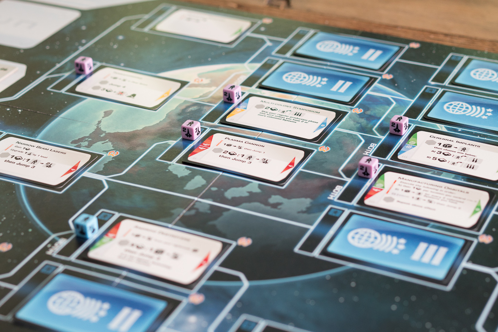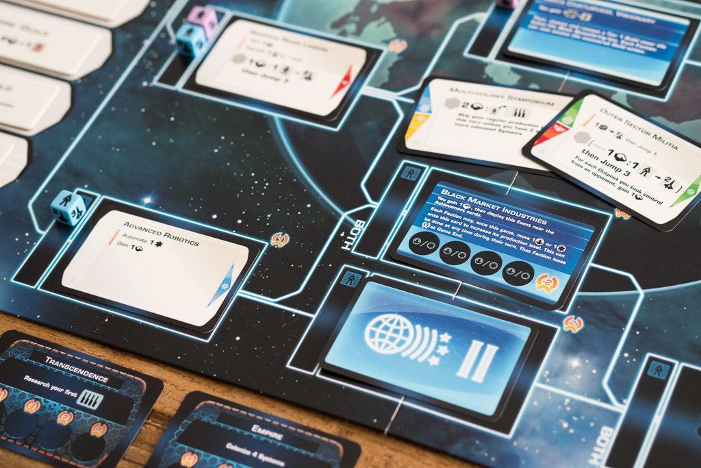 En la foto de arriba, el jugador azul está investigando una tecnología de nivel 2. Lo puede hacer porque previamente ha investigado las dos tecnologías anteriores en el árbol que conectan a ésta y se indica colocando un dado de población de su color en la casilla de la tecnología, junto a la carta. Al ser el primero en investigar la tecnología, desvela el evento que había boca abajo y descubre que se trata de «Industrias del mercado negro». Es una carta que cambia las reglas del juego, permitiendo a los jugadores colocar uno de sus discos ahí, de manera fácil, para conseguir recursos a cambio de perder al final de la partida dos puntos de victoria. Los eventos son sin duda uno de los puntitos de sorpresa y diversión del juego.