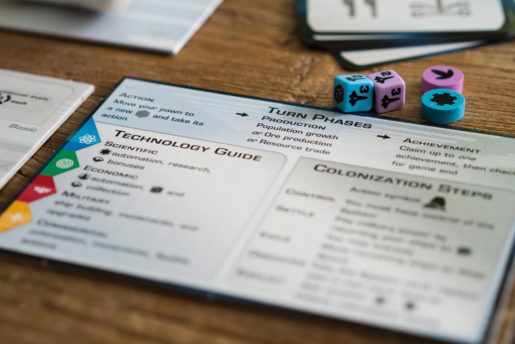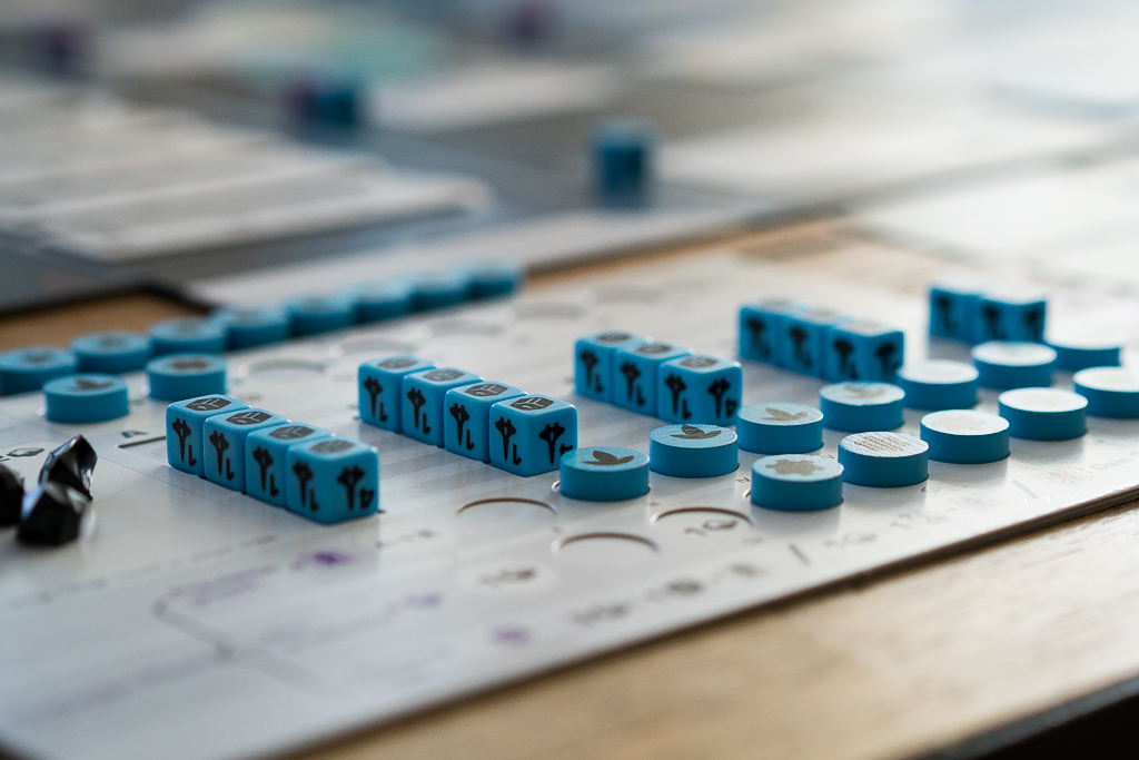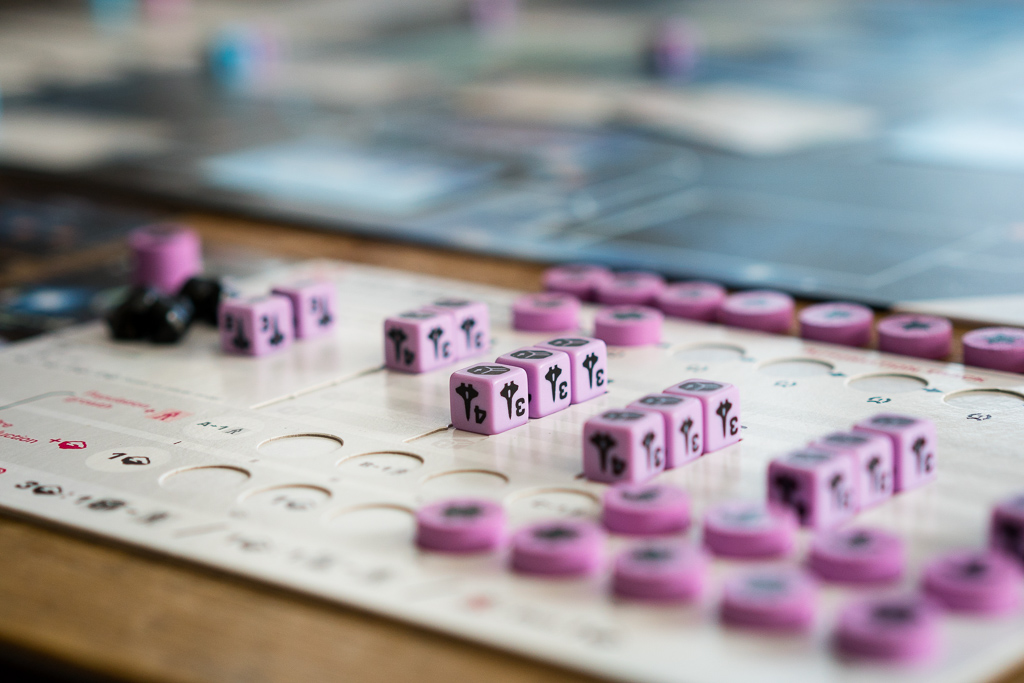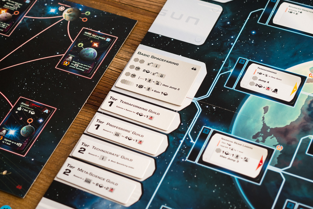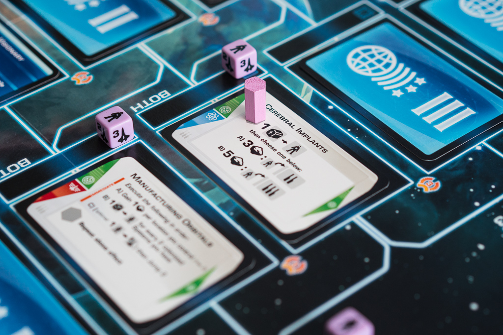 En la foto de arriba, el jugador azul está investigando una tecnología de nivel 2. Lo puede hacer porque previamente ha investigado las dos tecnologías anteriores en el árbol que conectan a ésta y se indica colocando un dado de población de su color en la casilla de la tecnología, junto a la carta. Al ser el primero en investigar la tecnología, desvela el evento que había boca abajo y descubre que se trata de «Industrias del mercado negro». Es una carta que cambia las reglas del juego, permitiendo a los jugadores colocar uno de sus discos ahí, de manera fácil, para conseguir recursos a cambio de perder al final de la partida dos puntos de victoria. Los eventos son sin duda uno de los puntitos de sorpresa y diversión del juego.
