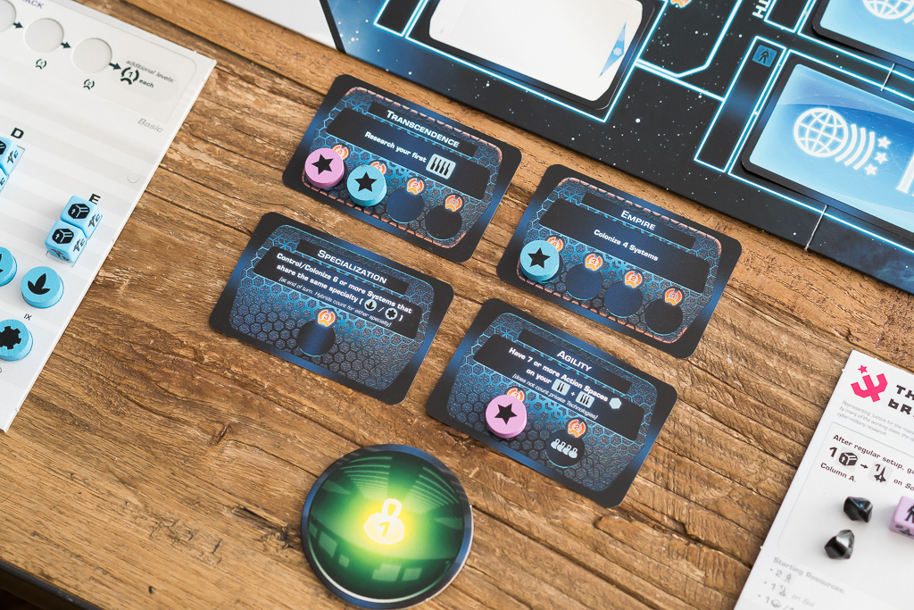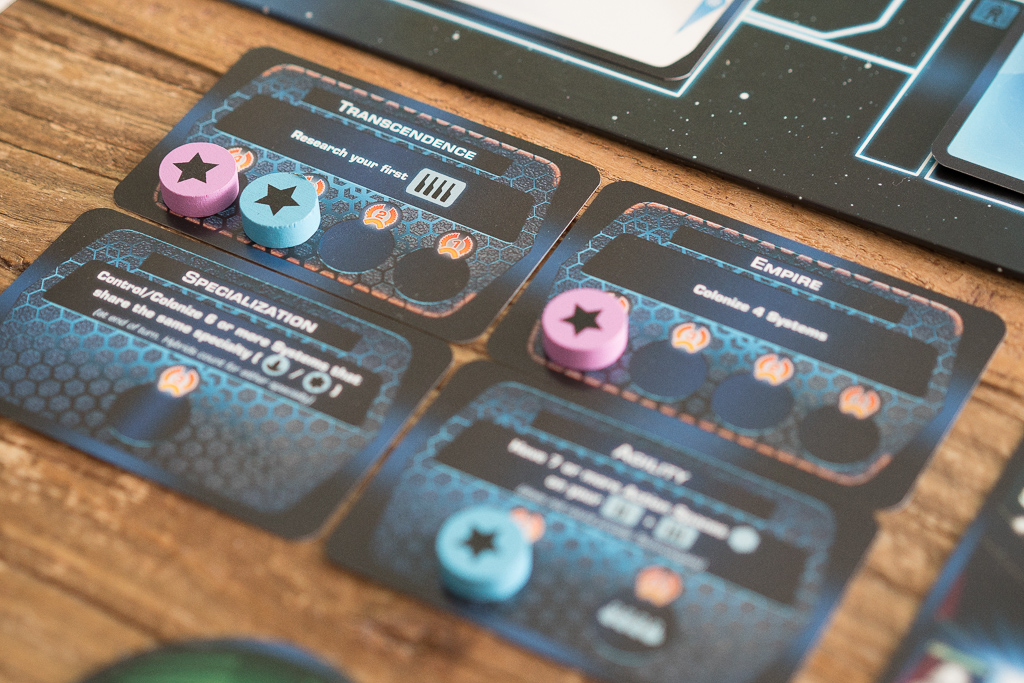 – Fase de logros, en la que reclamamos los que hayamos conseguido durante el turno. La partida termina cuando, dependiendo del número de jugadores, se ha conseguido alcanzar ciertos logros como descubrir una tecnología de nivel 4 o colonizar un número determinado de sistemas.