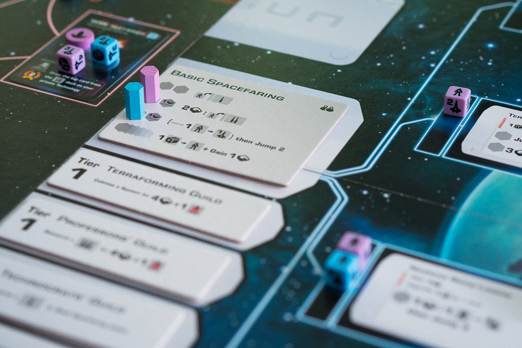 Por otro lado, tenemos el tablero de jugador. Ahí aparecen todos los recursos de nuestra corporación. En un principio, los recursos están ahí a la espera de que hagamos algo con ellos. Son dados, que no se lanzan, sino que se usan girándolos para mostrar una de sus seis caras. En origen son recursos standard (nada en concreto) y vienen representados por una caja, pero a medida que vayamos produciendo recursos, iremos destinándolos a algo que realmente valga la pena para avanzar en la partida: en población civil que nos ayude a mejorar el árbol de tecnologías (las del tablero grande central) o que podamos convertir luego en naves para explorar el espacio. Y luego están los minerales, que es otro recurso que podemos producir, con el que vamos a tener que pagar muchas de las cosas que queramos hacer.