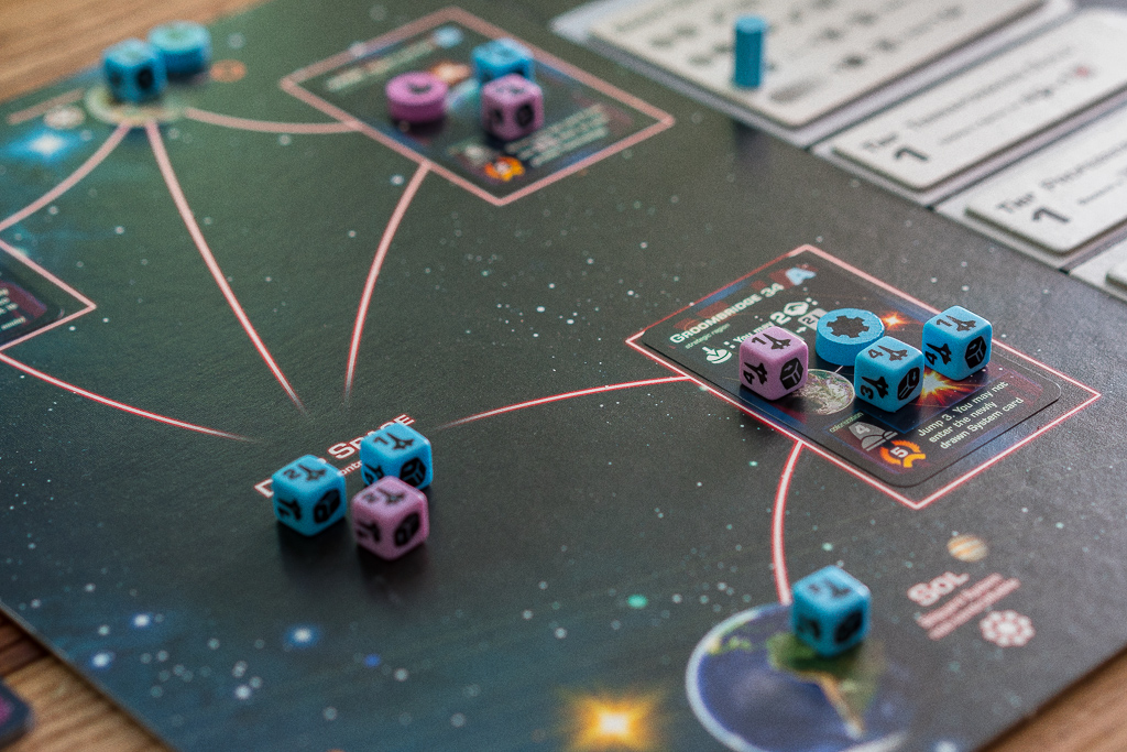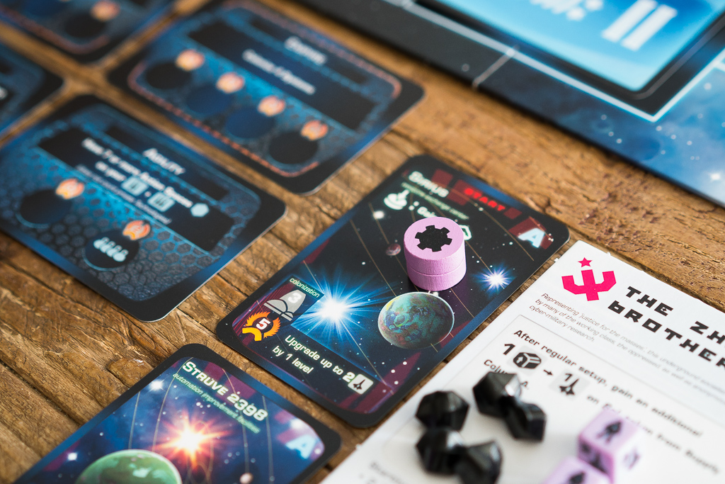 No se si habré conseguido transmitir lo bien conectado que está todo en el juego. No hay fisuras y a pesar de tener unas mecánicas abstractas, en el fondo todo tiene un sentido temático: los títulos de las cartas y lo que hacen, el uso de los recursos, que en un principio sólo es «capital» que tiene tu corporación y está en tí en qué materializar ese capital…¿en población? ¿en minerales? La población investiga tecnologías nuevas necesarias para la terraformación de planetas o lo que es lo mismo, te da acceso a nuevas acciones. Pero también puedes convertir a tu gente en grandes pilotos de naves que exploren el espacio en busca de un lugar mejor para vivir… Es una lucha de corporaciones por ser los primeros en conseguir logros que permitan a los terrícolas habitar nuevos sistemas. Sistemas para los cuales, por cierto, se han usado nombres reales de los que se pueden divisar desde la Tierra. Se nota y se siente, que el tema está presente 😀