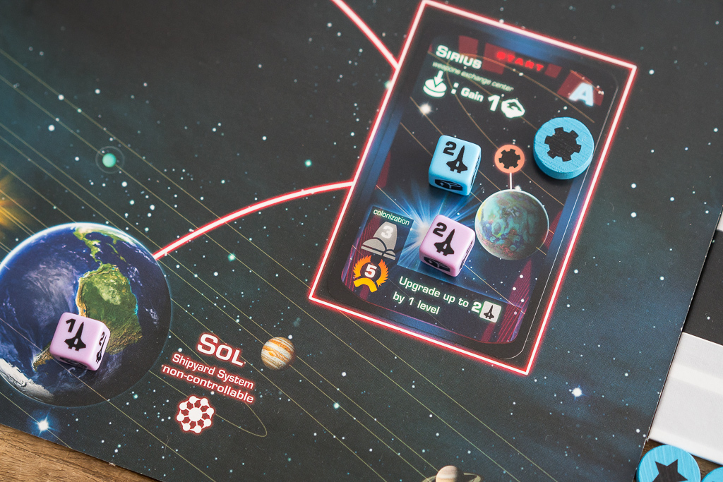 Pero claro, con una nave no hacemos nada, así que tendremos que pensar en aprovechar esa misma acción que nos permite mover, para convertir población, en naves y aumentar así nuestra potencia militar. Eso si, la naves sólo pueden construirse en «astilleros» espaciales, como el Sol y otros lugares marcados como tal, luego te tocará ir pegando saltos de flor en flor planeta en planeta para lograr controlarlos. En esta foto el jugador azul llegó primero a Sirius y colocó su disco de producción en el planeta porque era el único con naves allí. Se convierte automáticamente en el jugador que lo controla. El jugado rosa acaba de llegar con su nave de nivel dos, pero aún su potencia militar no supera a la del azul, así que no es suficiente para arrebatarle el control. Quizá aumentando a 3 el nivel de la nave o pegando un salto con la de nivel uno desde el Sol, podría valer. Luego, para colonizarlo, hay que gastar otra acción diferente y conseguir tener en ese momento tanto los recursos necesarios como la potencia militar mínima requerida, que en este caso, es de 3 (icono de colonización). Un sistema de exploración espacial simple pero efectivo, que te mantiene en tensión durante toda la partida para ver quien se lleva los sistemas que darán algunos bonificaciones y muchos puntos al final de la partida. Es una danza continua de naves por el espacio.